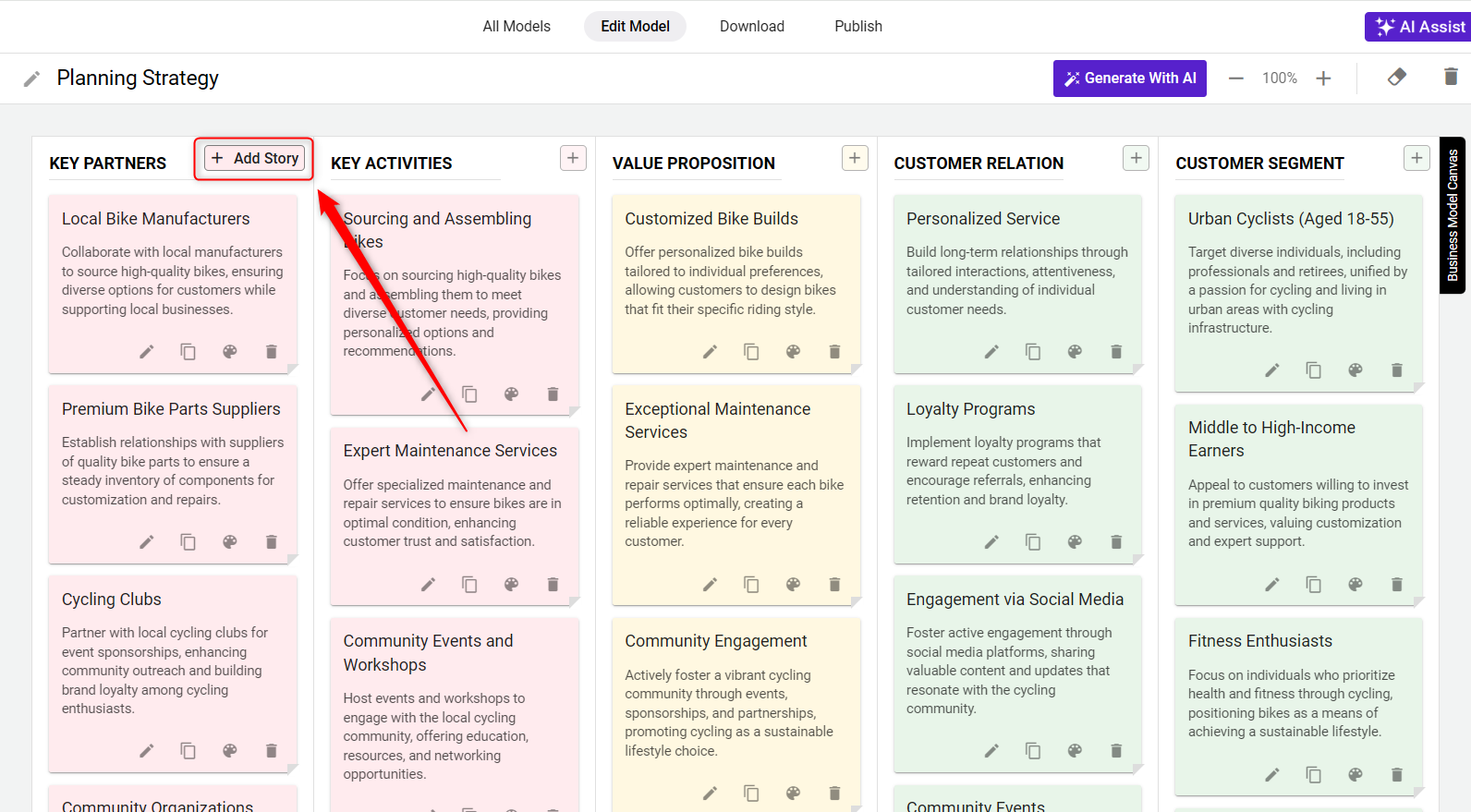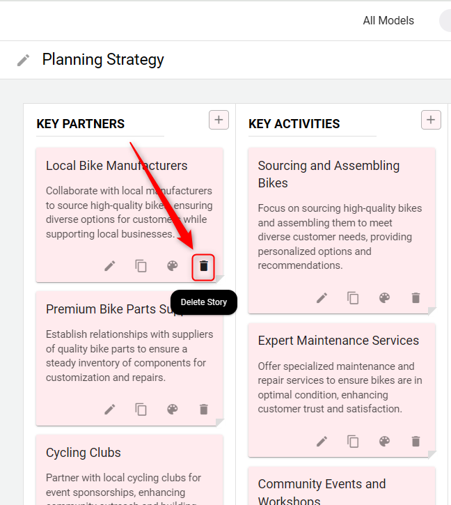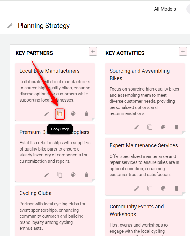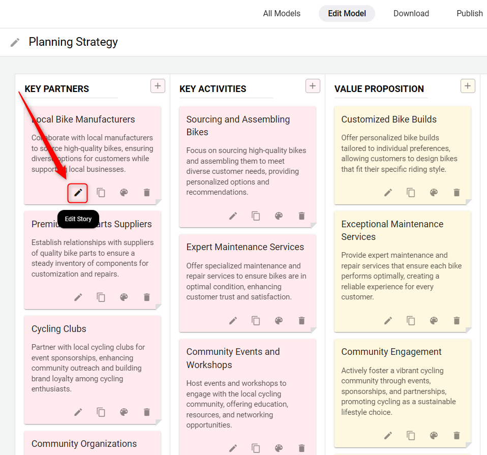 To begin adding content to your strategic model, click on the "+" icon within any element section. You can add multiple stories to each element by repeatedly clicking on the "+" option.