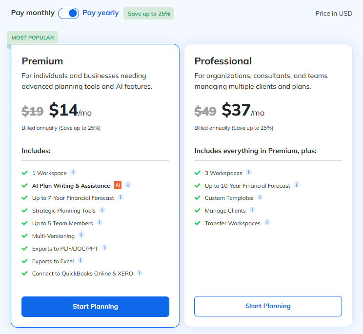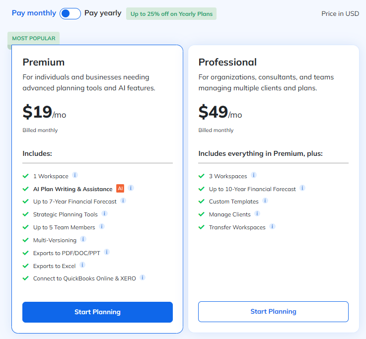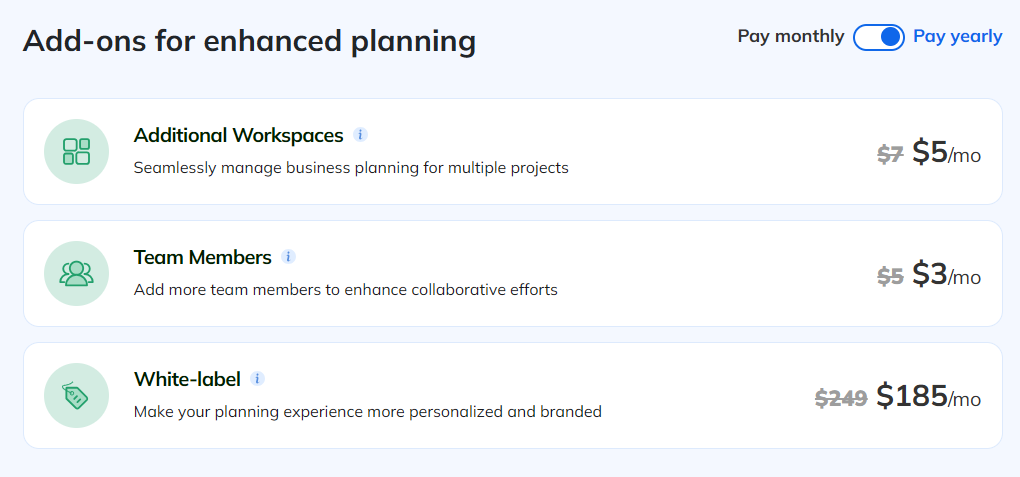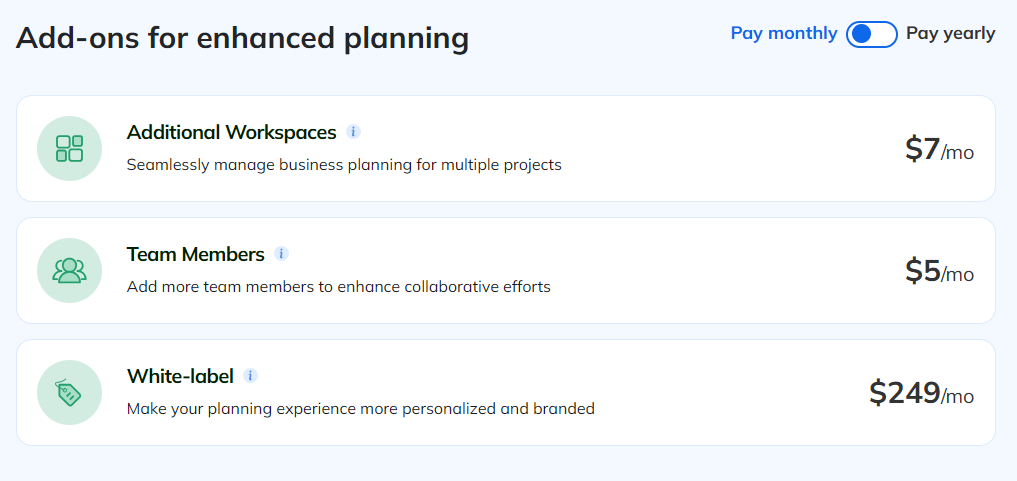 - Extra Workspace: Expand your project space to accommodate multiple business plans or client accounts. For details on adding more workspaces, visit here.