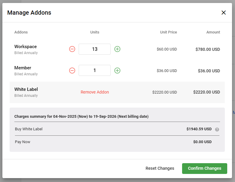 Extend the functionality of your subscription plan with our specialized add-ons. Available for purchase alongside our standard plans, these add-ons give you the power to add Extra workspaces, include additional team Members, or apply your own branding with our White Label feature.