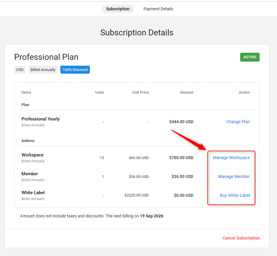You can purchase, manage, or cancel your add-ons from the Subscription section of your Upmetrics account itself.