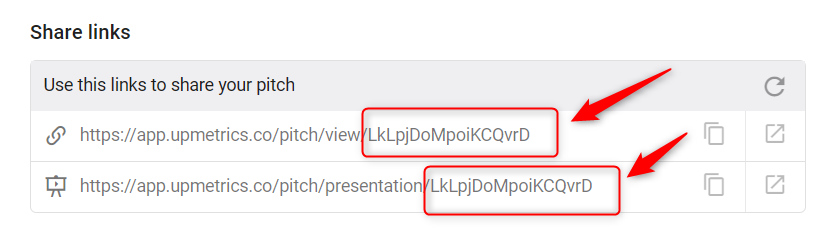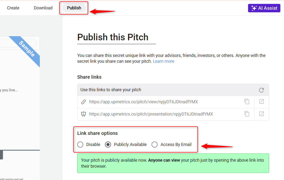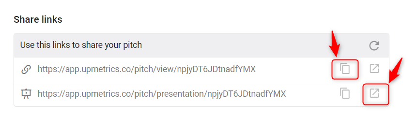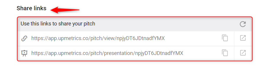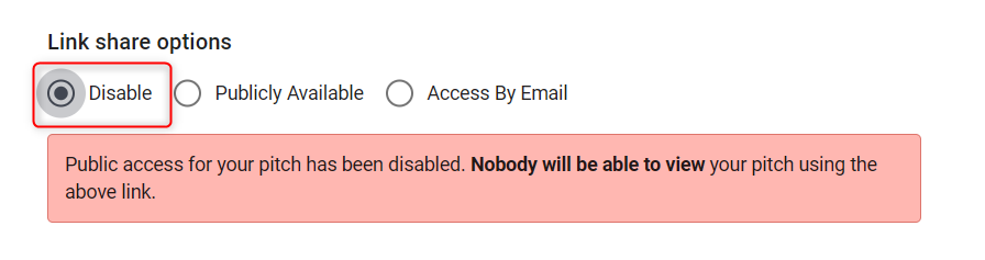 - Disable: If you wish to keep your pitch deck private or temporarily restrict access, you can disable the sharing links.