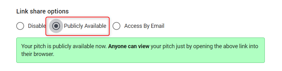 - Publicly Available: This option allows anyone with the link to view your pitch deck without any restrictions, making it ideal for broad sharing.