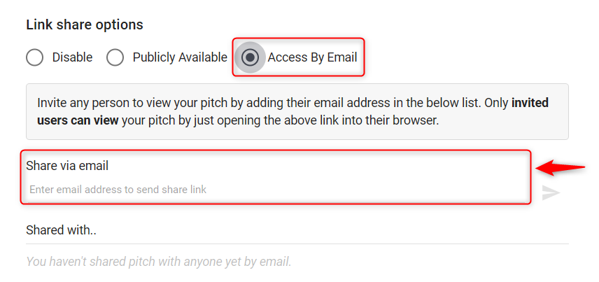 - Access By Email: For added security, you can require viewers to provide their email addresses before accessing your pitch deck. This option gives you more control over who views your presentation and can be used to track interest.