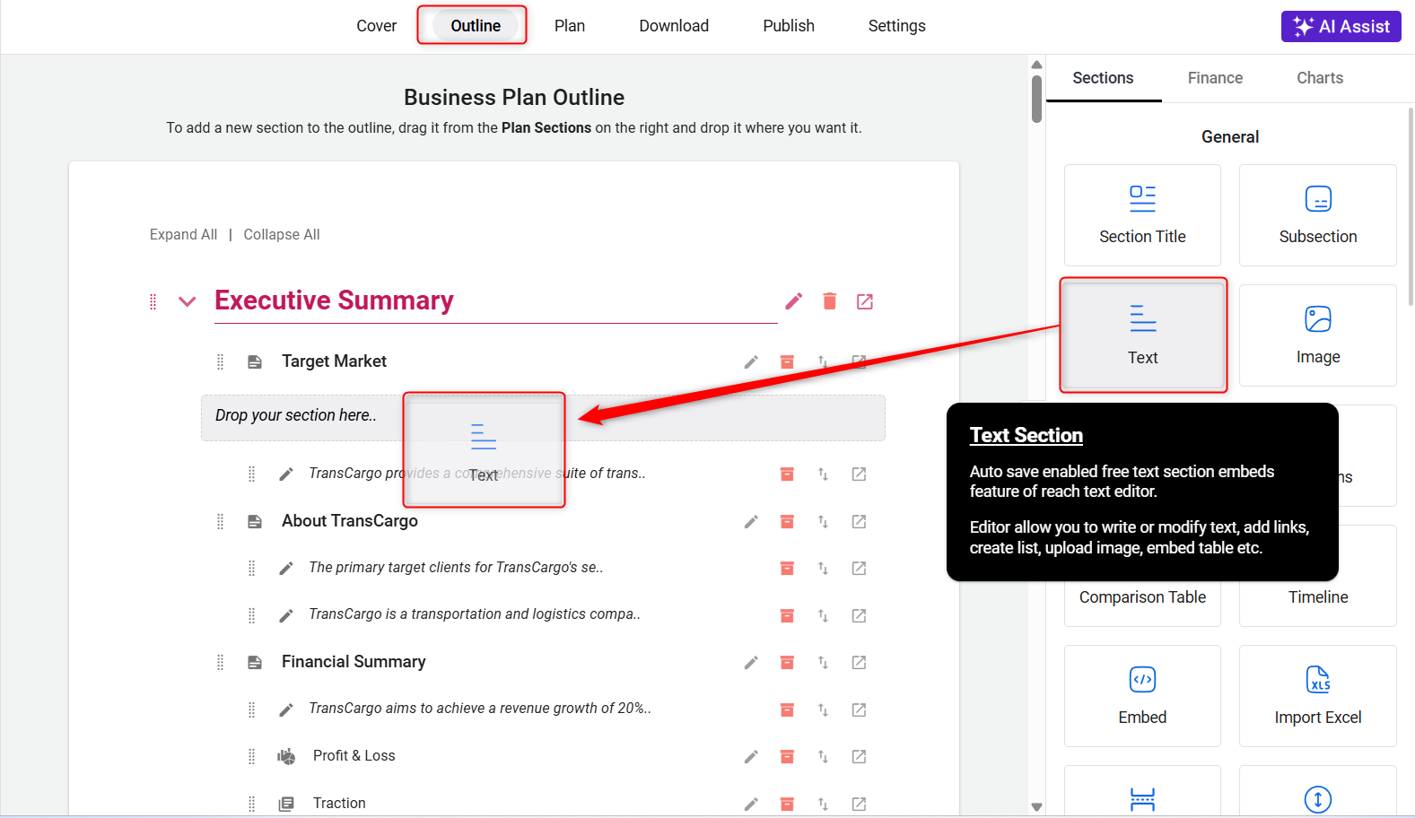 With the drag-and-drop feature, easily add any required sections to your plan's outline.