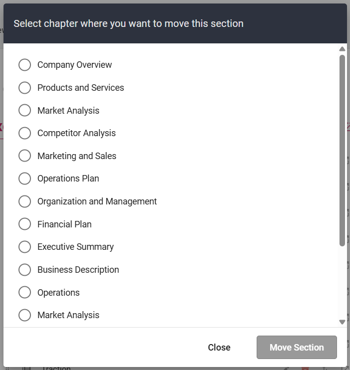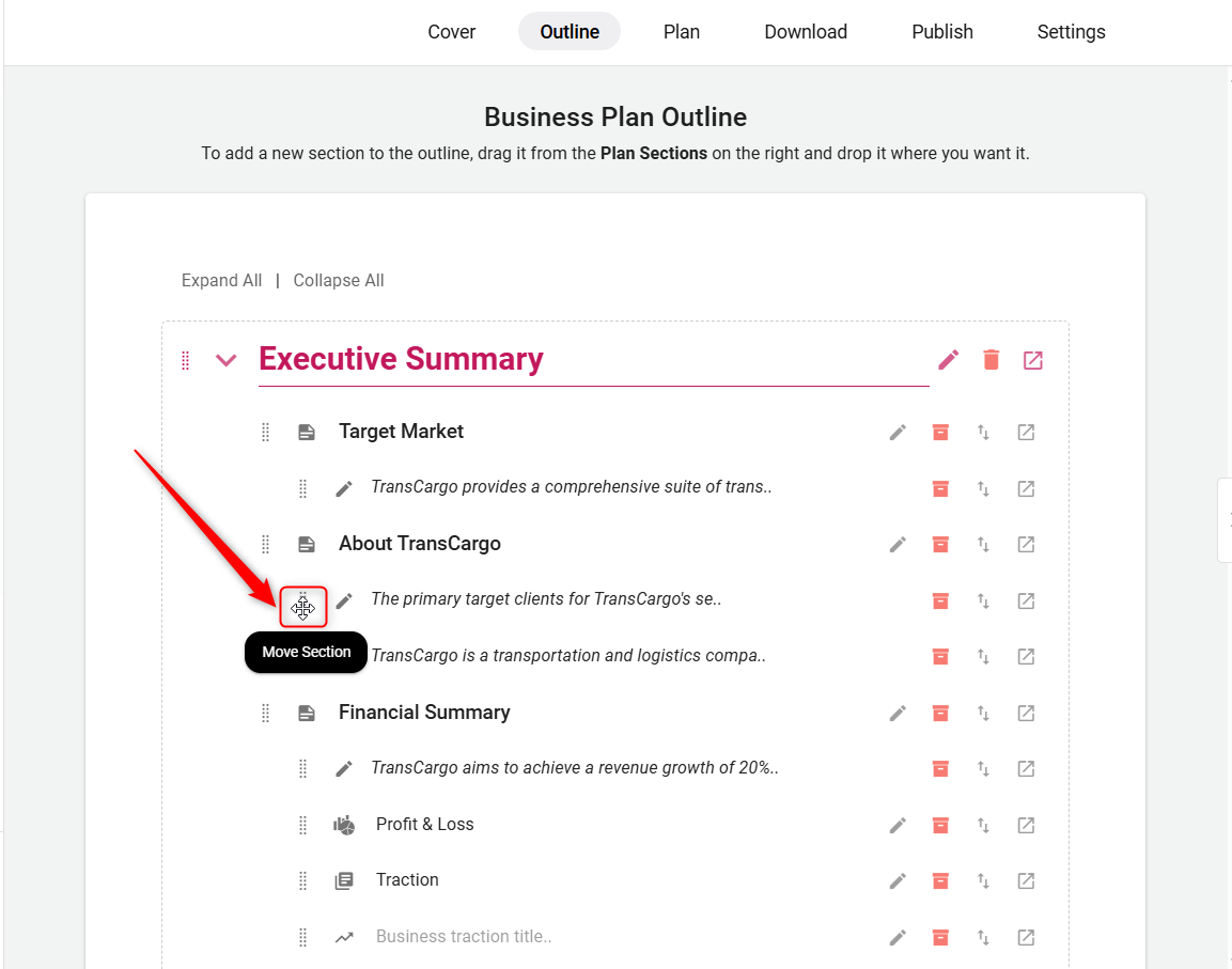 Adjust the structure of your business plan for a more logical flow by moving options to reflect your preferences by dragging.