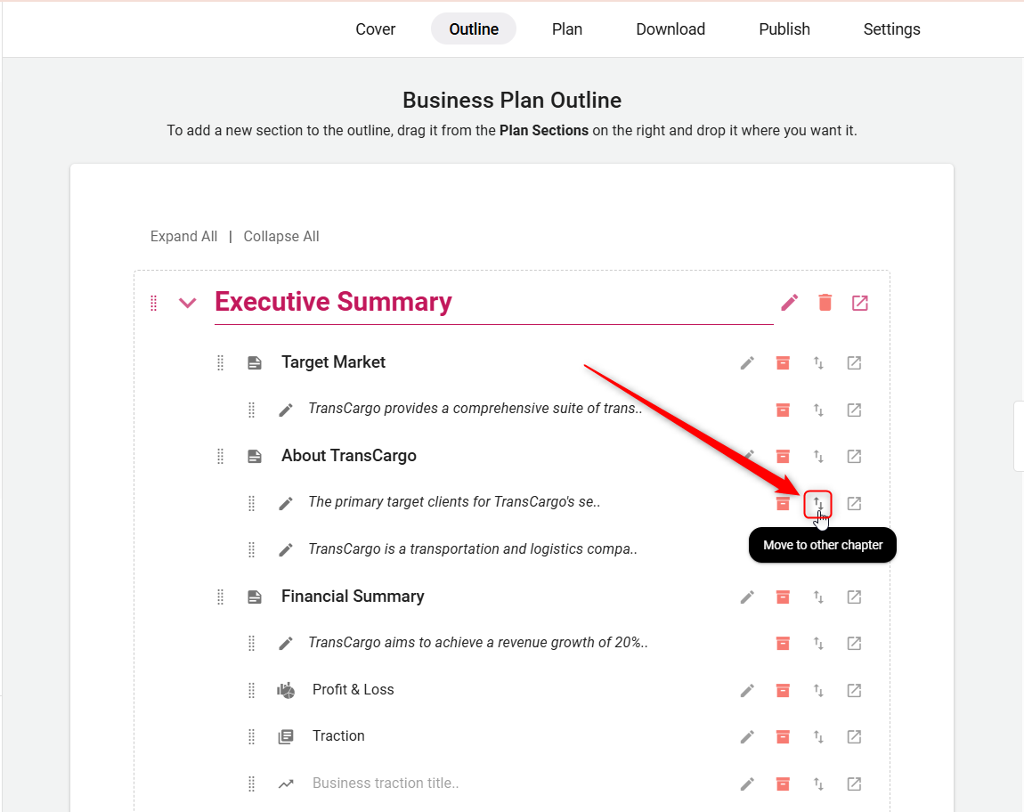 Rearranging the sections of your business plan can be done with ease, allowing you to move sections within the same chapter or to different chapters as needed.