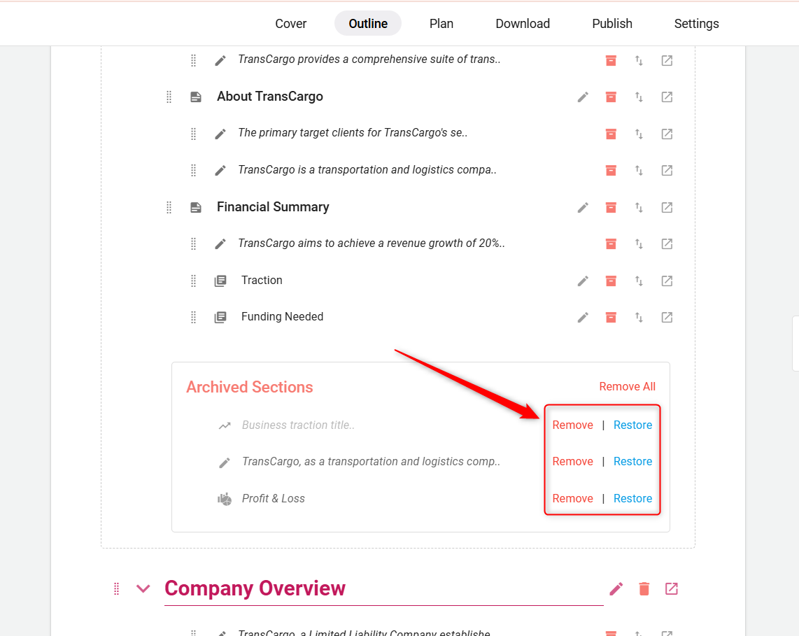 If there are sections that currently do not fit into your business plan, you have the option to archive them. This option temporarily removes unnecessary sections without permanently deleting them.