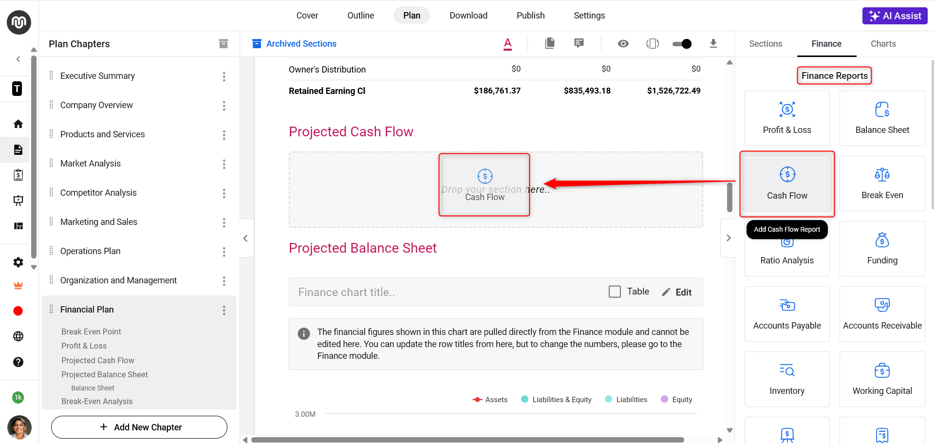 Use the intuitive drag-and-drop feature to include key financial statements like profit and loss, cash flow, and balance sheet into your plan.