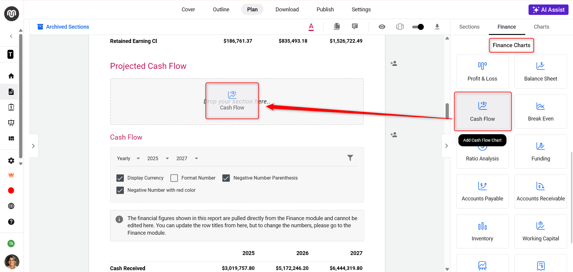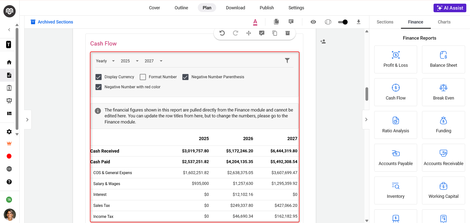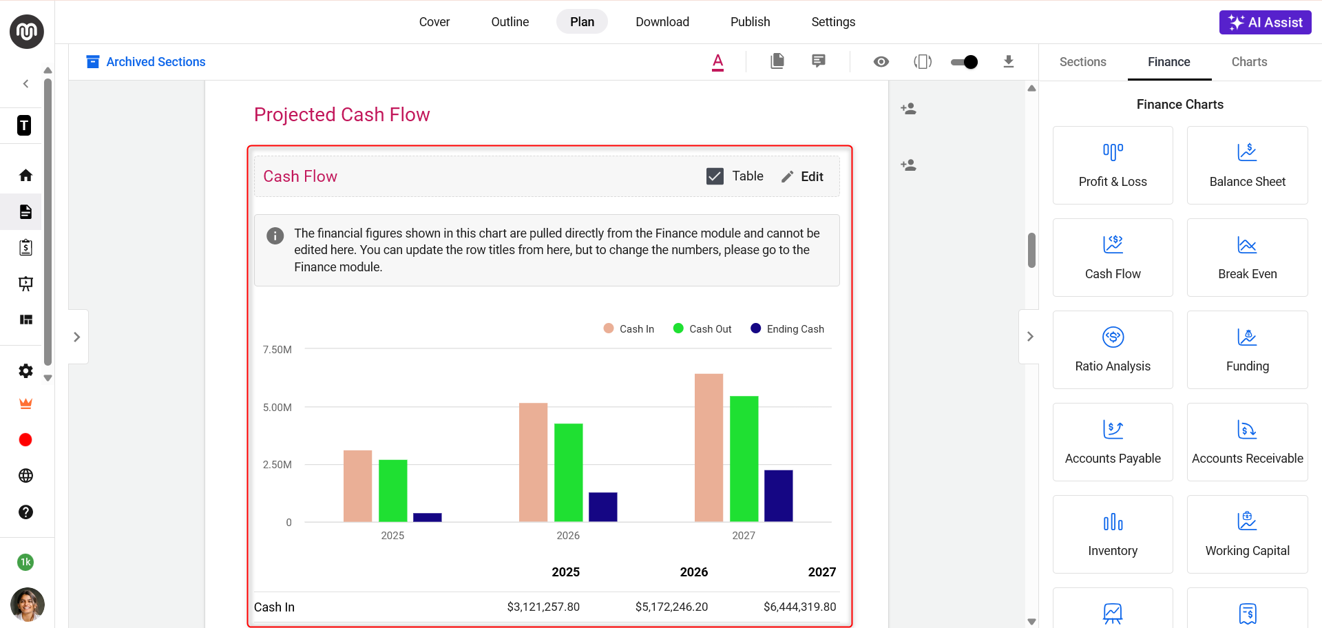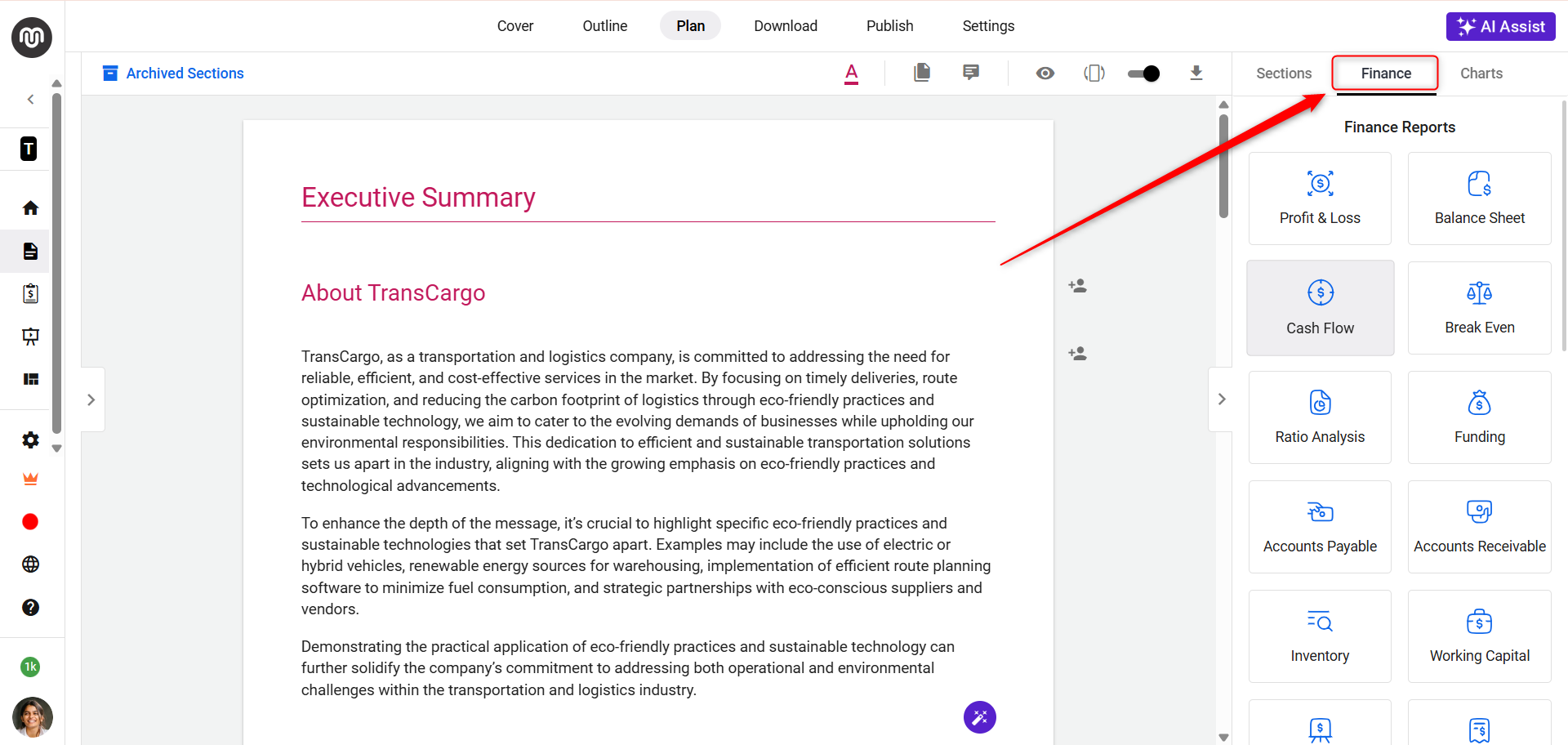 You can embed your financial reports and charts into your business plans. This feature ensures a thorough representation of your financial standing, providing a solid foundation for your business's projected success.