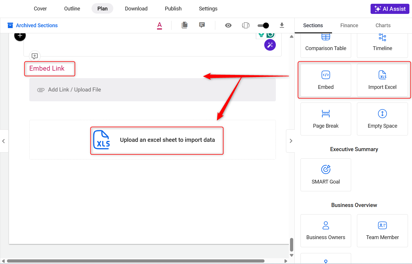 - Embed: The Embed feature allows you to directly integrate your existing Excel data into your business plan. You have the flexibility to either use a link to embed the Excel sheet files or opt for direct upload within your Business Plan