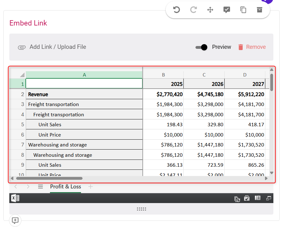 Once you've embedded the Excel sheet, it will look like this in your Business Plan. Please see the below image: