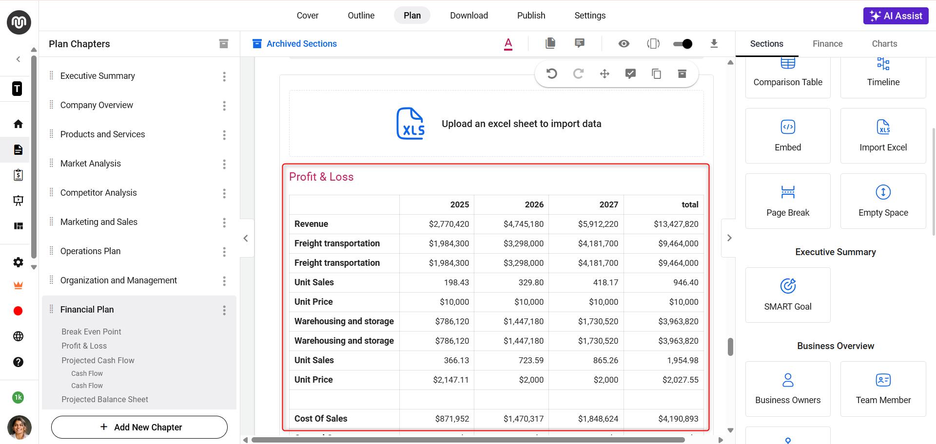 NOTE: You can use the Import Excel option to showcase your financial data inside the business plan. However, this data remains static and will not be connected to the financial forecasting module, as it's treated as manually added information.