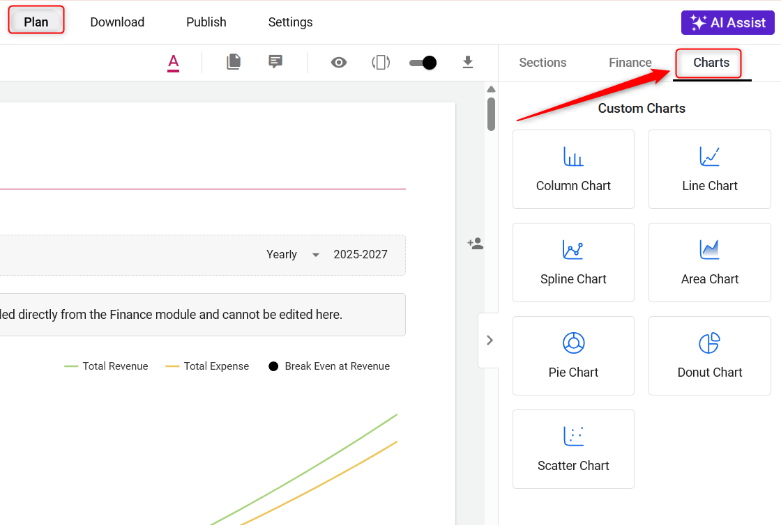 To add the Chart, navigate to your business plan and locate the Charts section on the left sidebar.