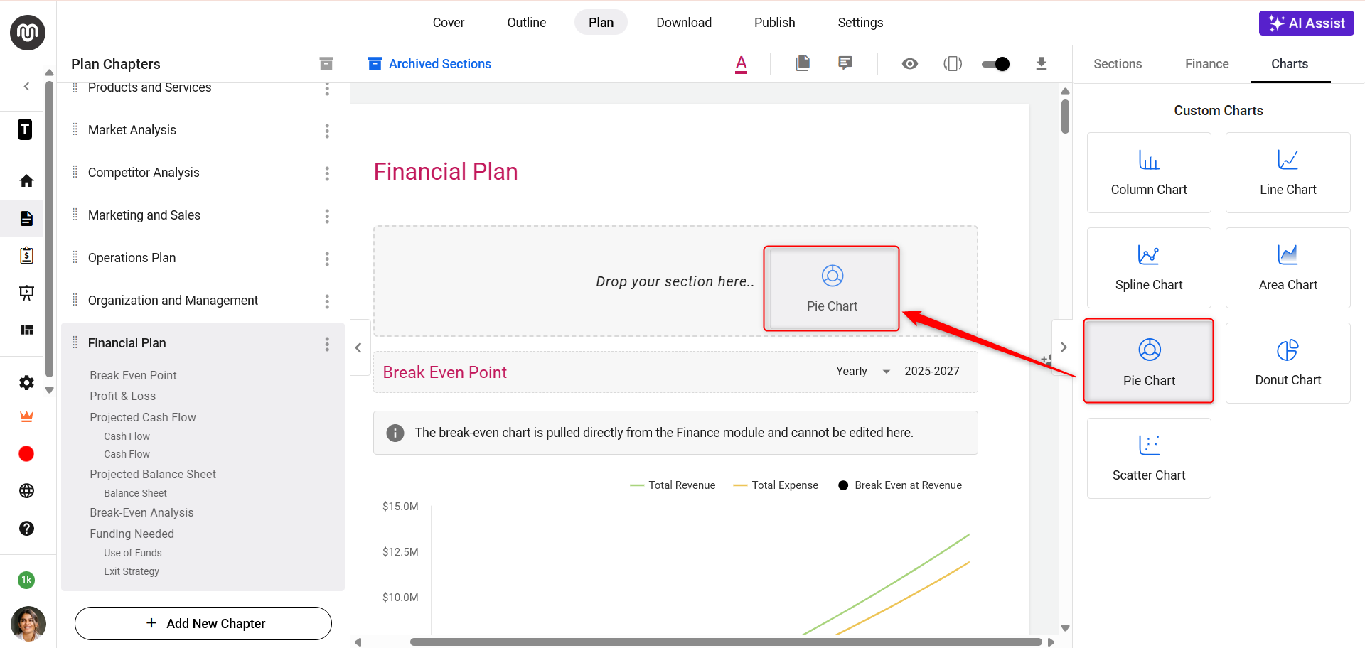 Utilize the drag-and-drop feature to add a chart to your Business Plan.