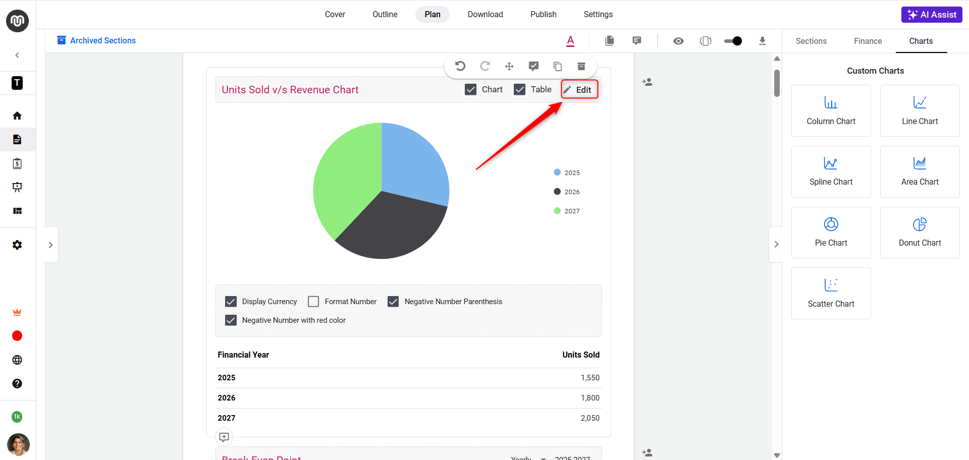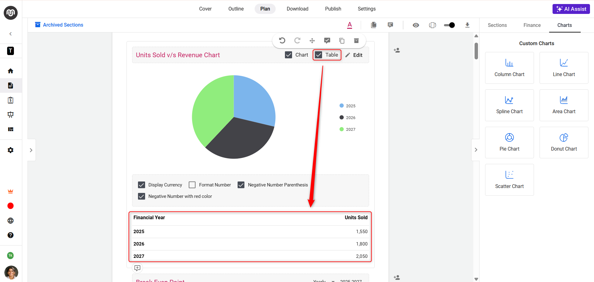 In the Business Plan builder, the ability to customize your financial presentation is paramount.