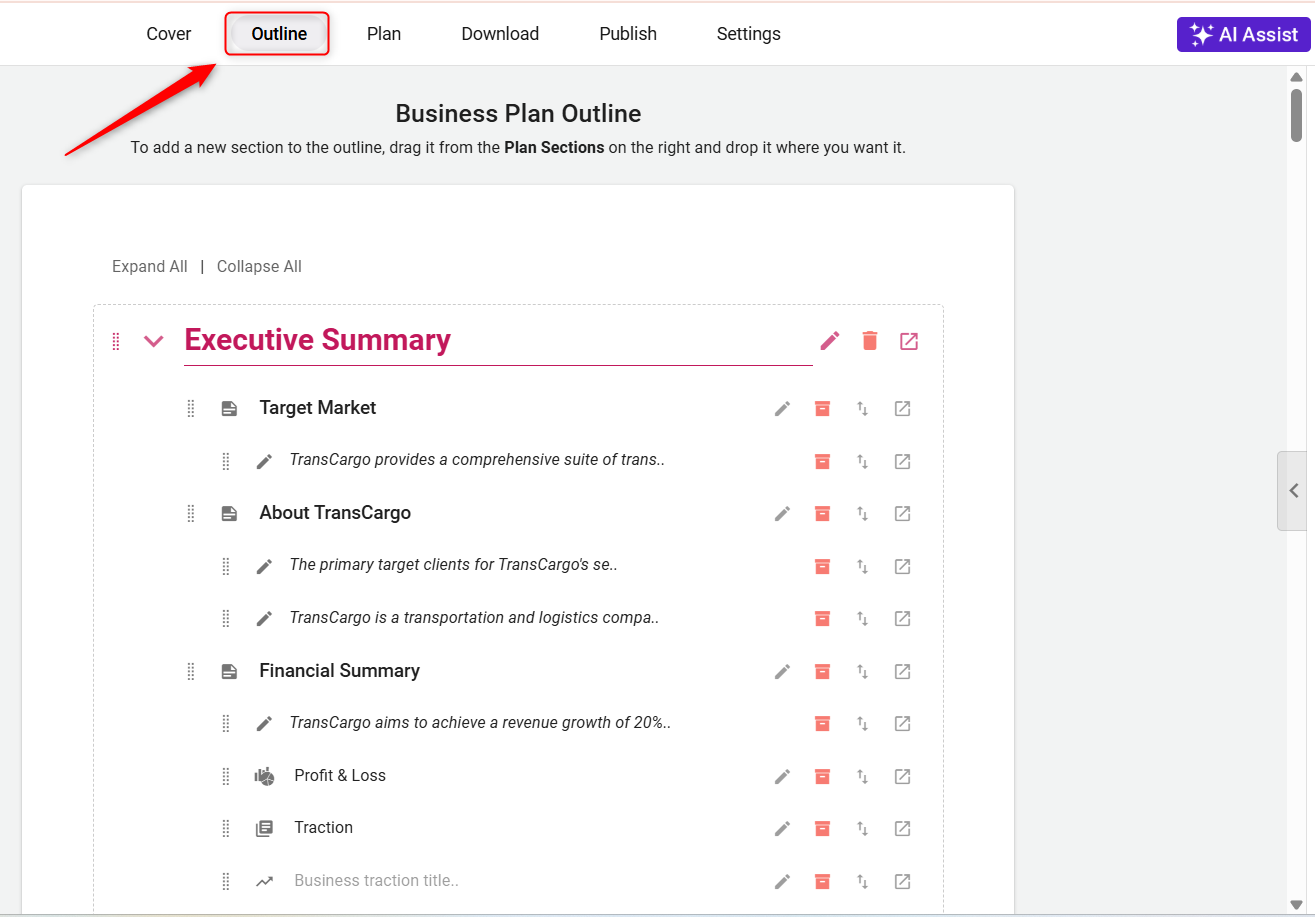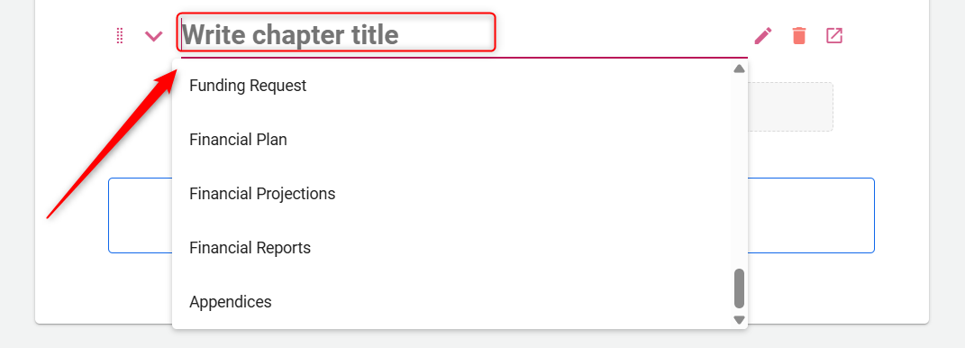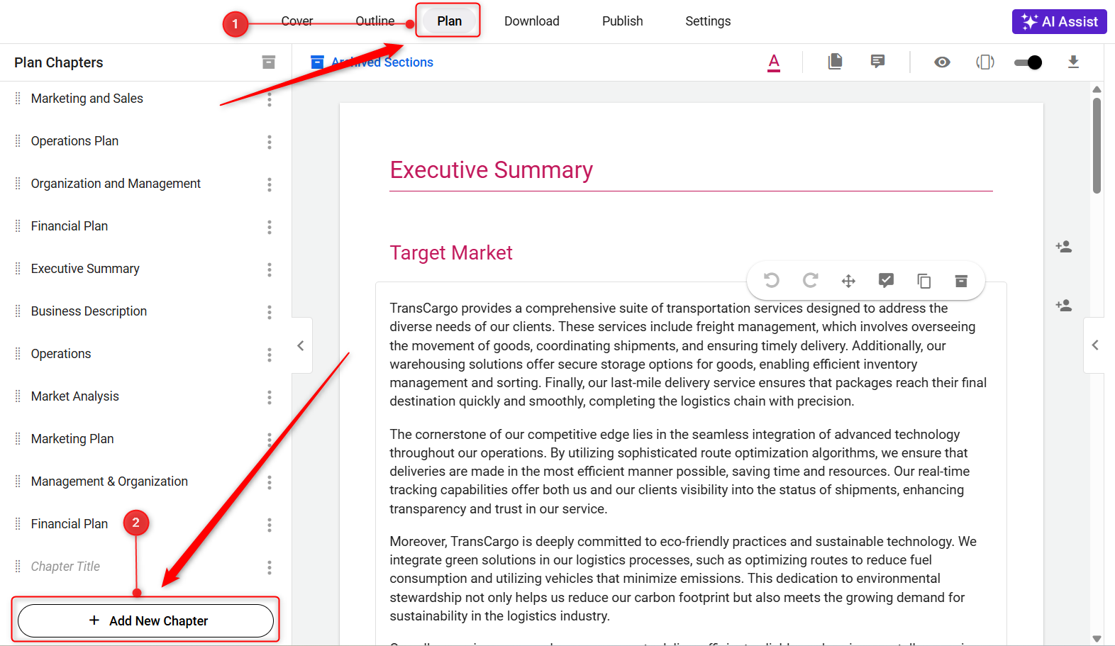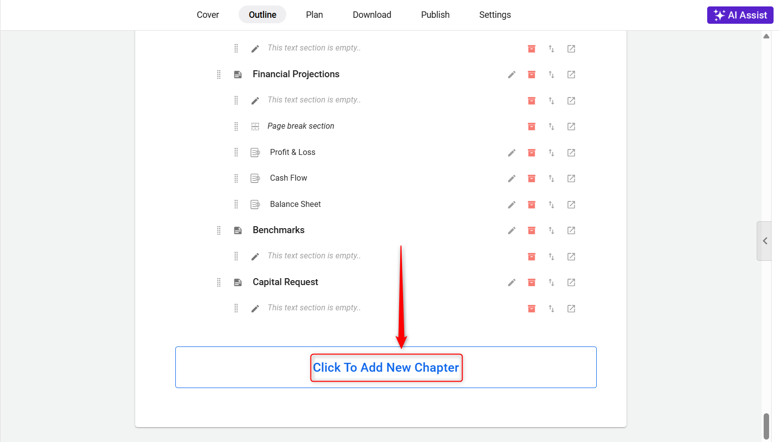 The Outline Section serves as the backbone of your business plan. To add a new chapter through this section, follow these simple steps: