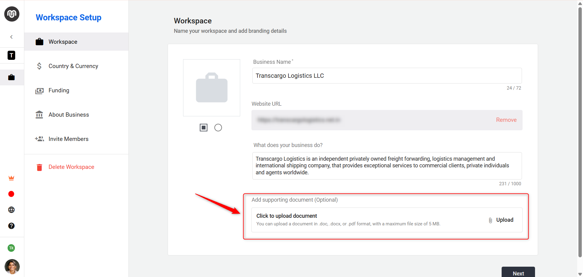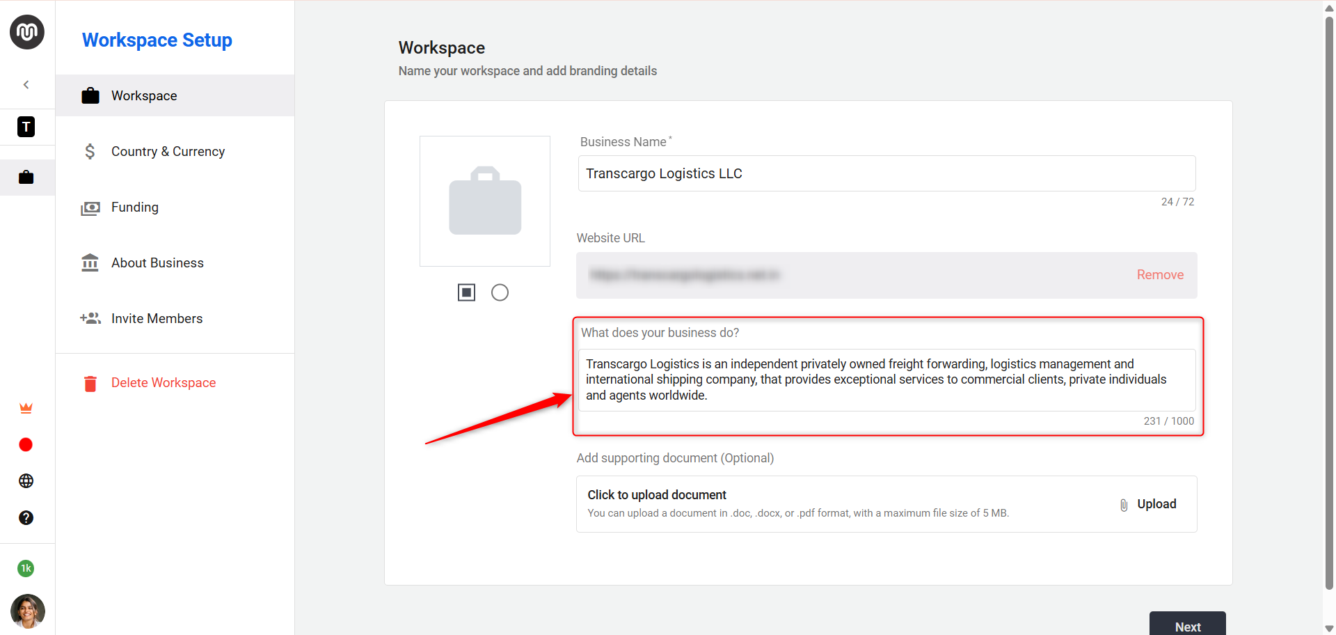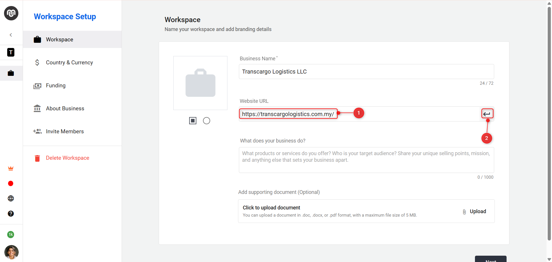 When you begin setting up your workspace, enter your website URL in the provided field and press the Enter key. The system will fetch key business information from your website.