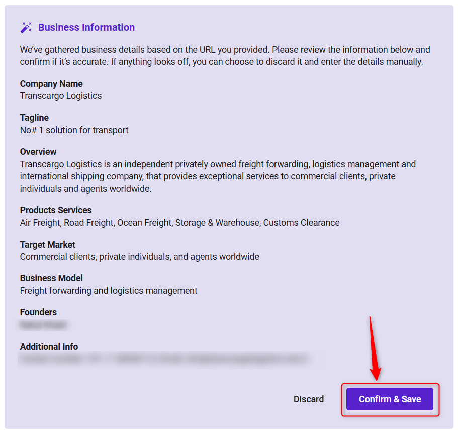 A preview box will appear displaying the collected business details. Click on Confirm & Save to apply them.