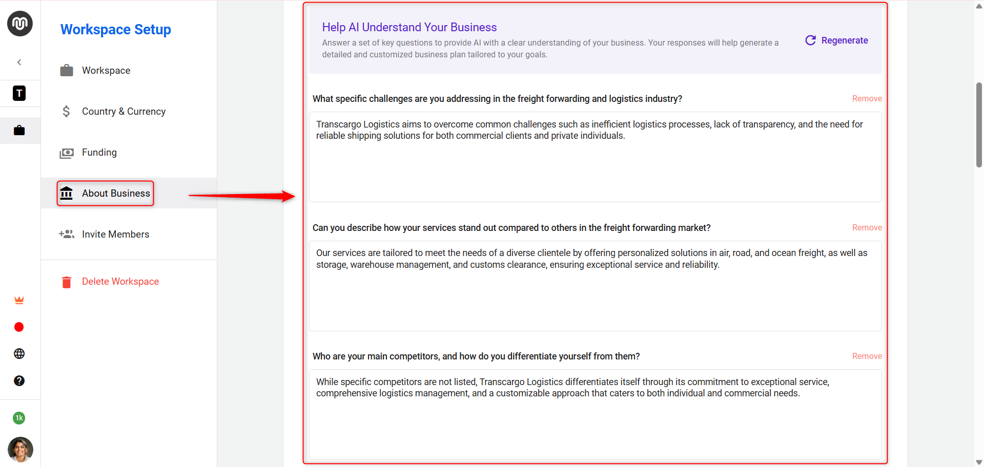 In the About Business section, the AI will generate a series of smart questions designed to better understand your business and tailor the business plan accordingly.