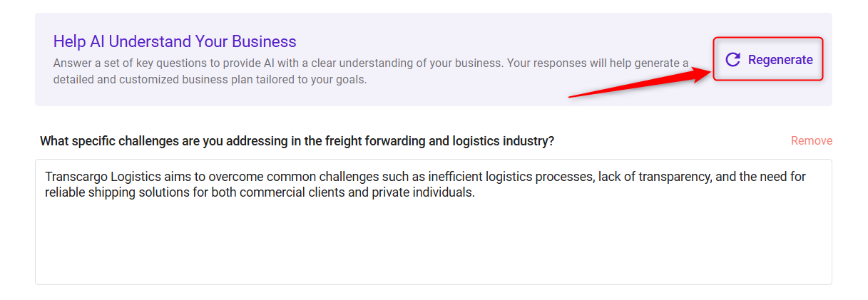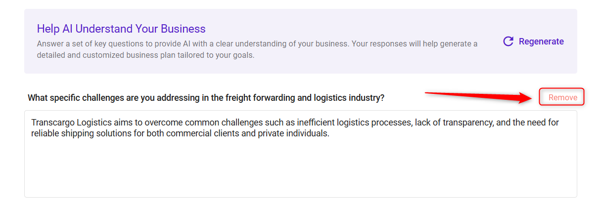 Add your own custom questions and answers to further train the AI. These personalized inputs allow the AI to create a more accurate and relevant business plan. Additionally, you have the flexibility to remove any AI-generated questions that are not useful or relevant to your planning process.