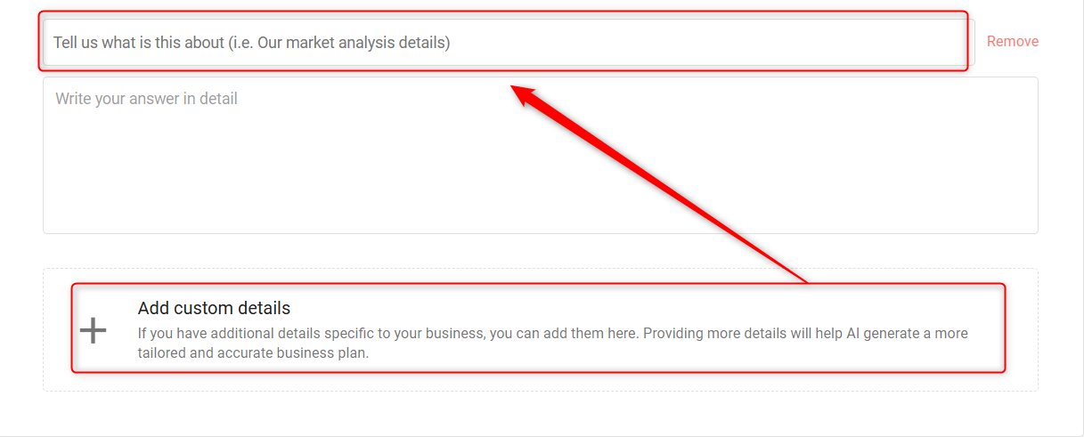 - You also have the flexibility to add your own custom questions and answers using the Add custom details option. This allows you to input specific details or insights about your business that the AI can then use to generate a more accurate and personalized business plan.