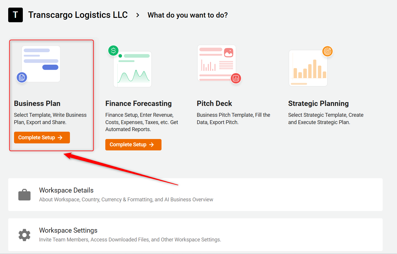 - Smart Questionnaire: Upon setting up your workspace, AI asks preliminary questions about your business. This initial interaction helps tailor the business plan to your specific needs and objectives.