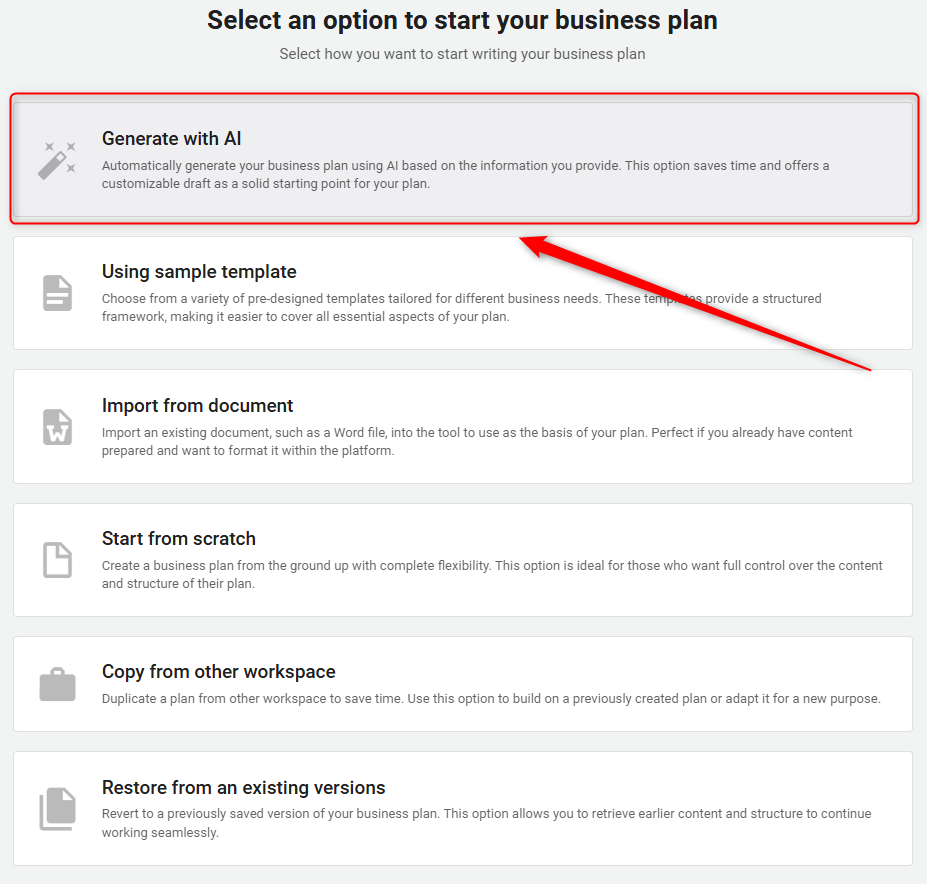 Next, inside the business plan builder, click on the Generate with the AI option.