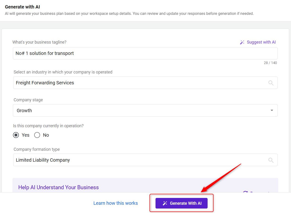 - AI-Powered Suggestions: While setting up your Business Plan, the "Generate with AI" option becomes available. This feature utilizes the details you've input to create an outline and auto-fill sections of your plan, ensuring a cohesive and comprehensive document.