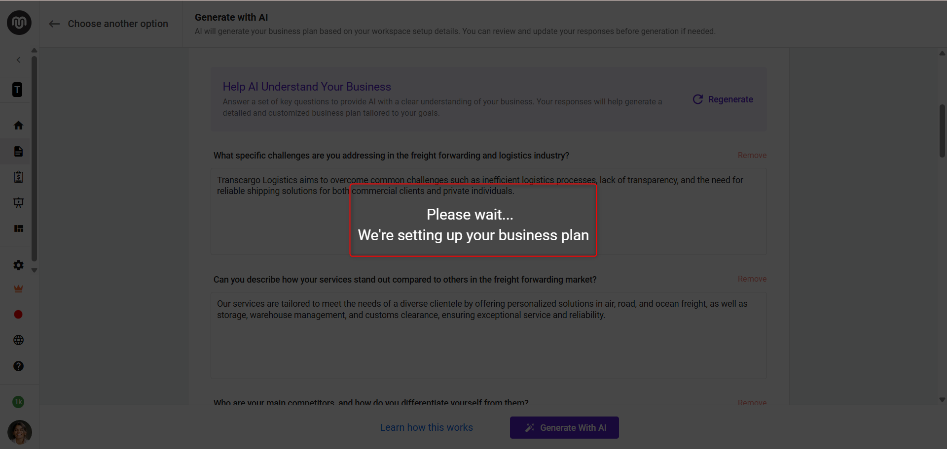 Once everything looks good, click on the Generate with AI option to let the AI create your business plan.