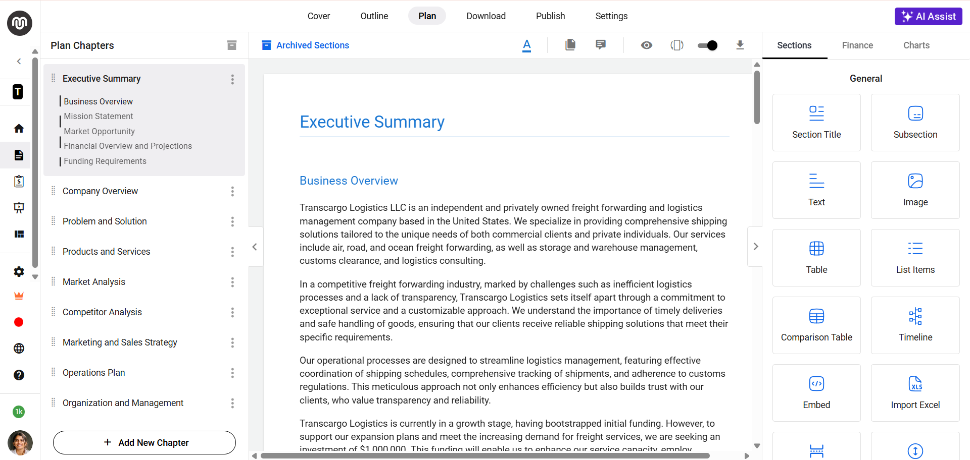 By integrating AI Assistance, transforming how business plans are created. This feature simplifies the complex steps involved in crafting a strategic plan, offering personalized guidance to ensure that every plan is not only comprehensive but also uniquely aligned with the business's goals.