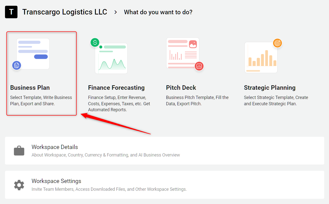 Go to the workspace menu, locate the Business Plan builder, and click on it.