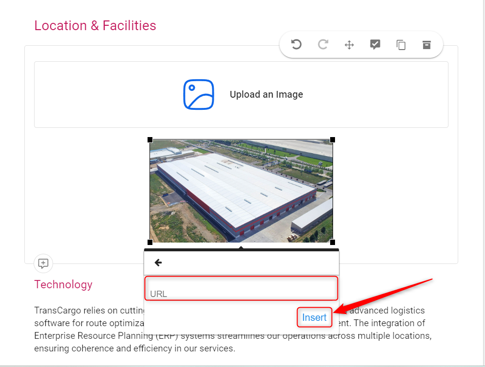 Click on the Insert Image option will open a popup dedicated to image uploads.