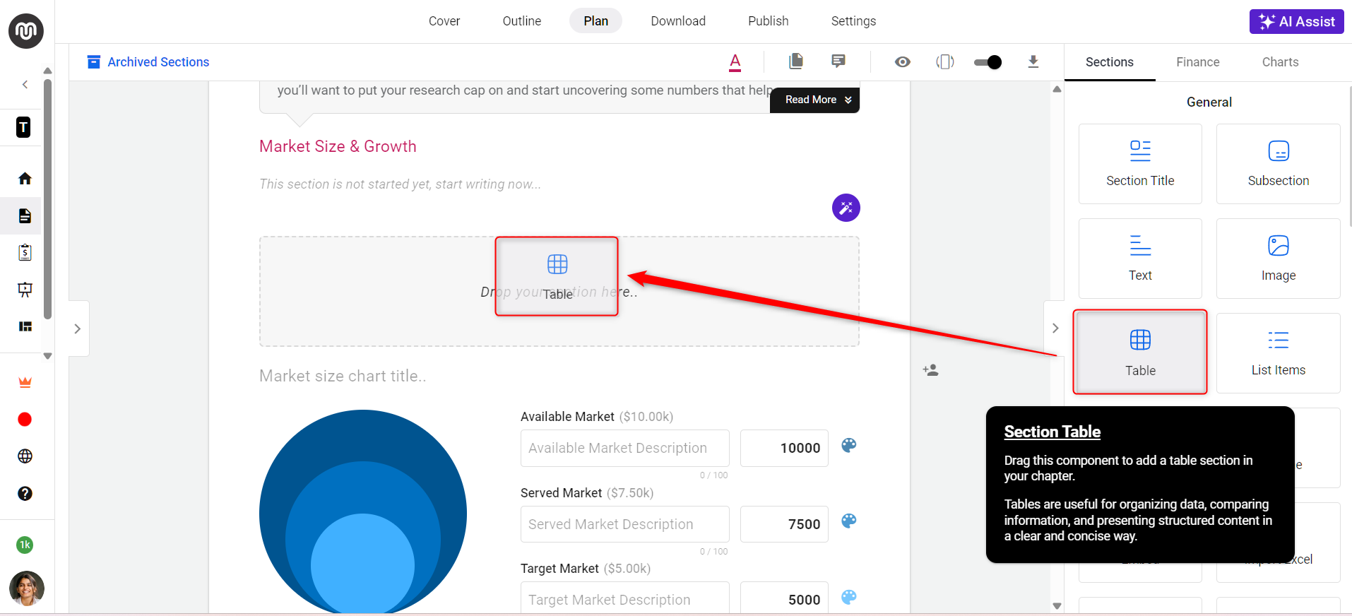 Here, look for the Table elements in the sidebar of the business plan builder. Drag this element to your preferred location within the plan.