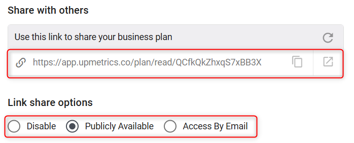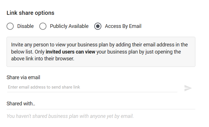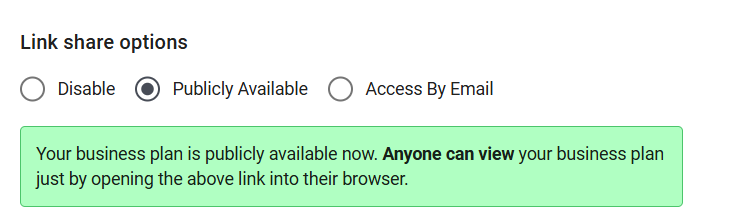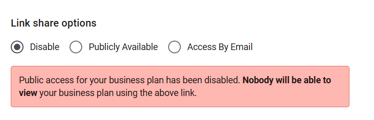 Select the option to publish your business plan via a Secret Unique Link and choose the access options (Disable, Publicly Available, Access By Email) accordingly.