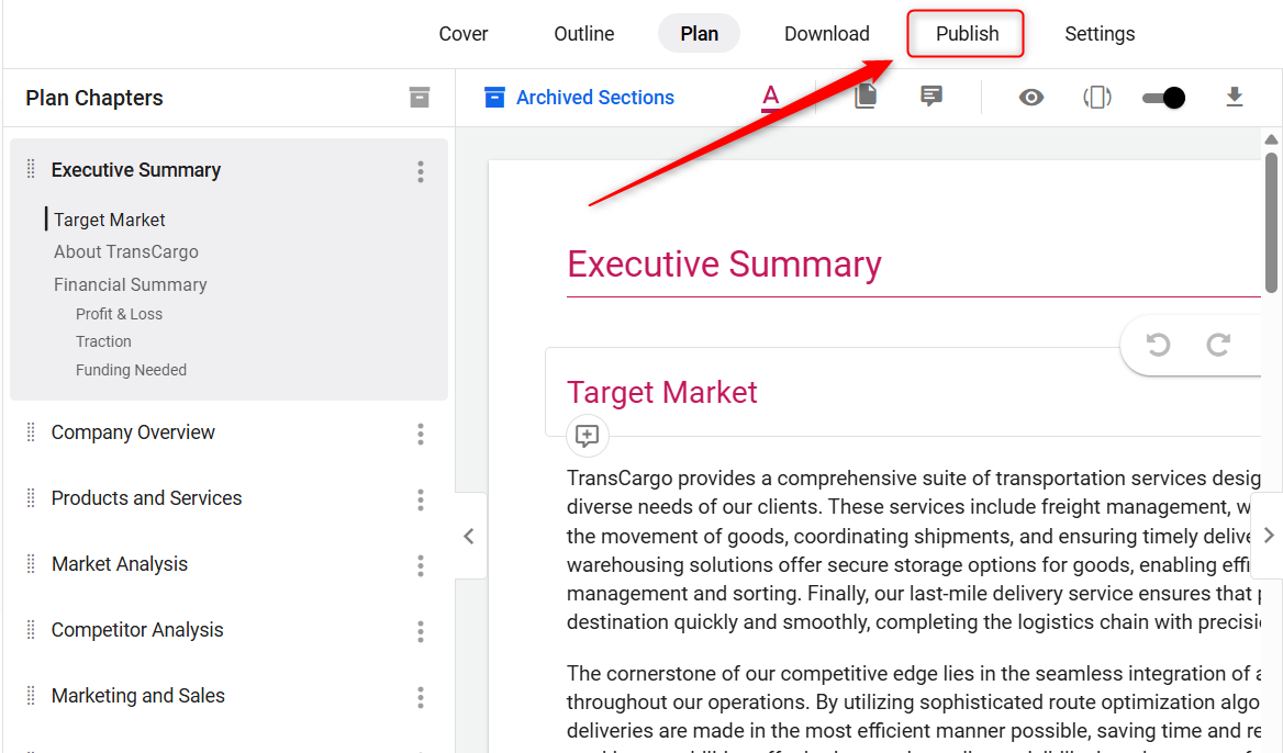 Beyond downloading, it facilitates the publishing of your business plan through shareable links or dedicated web pages.