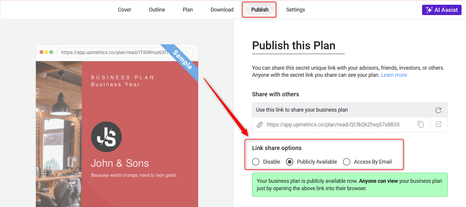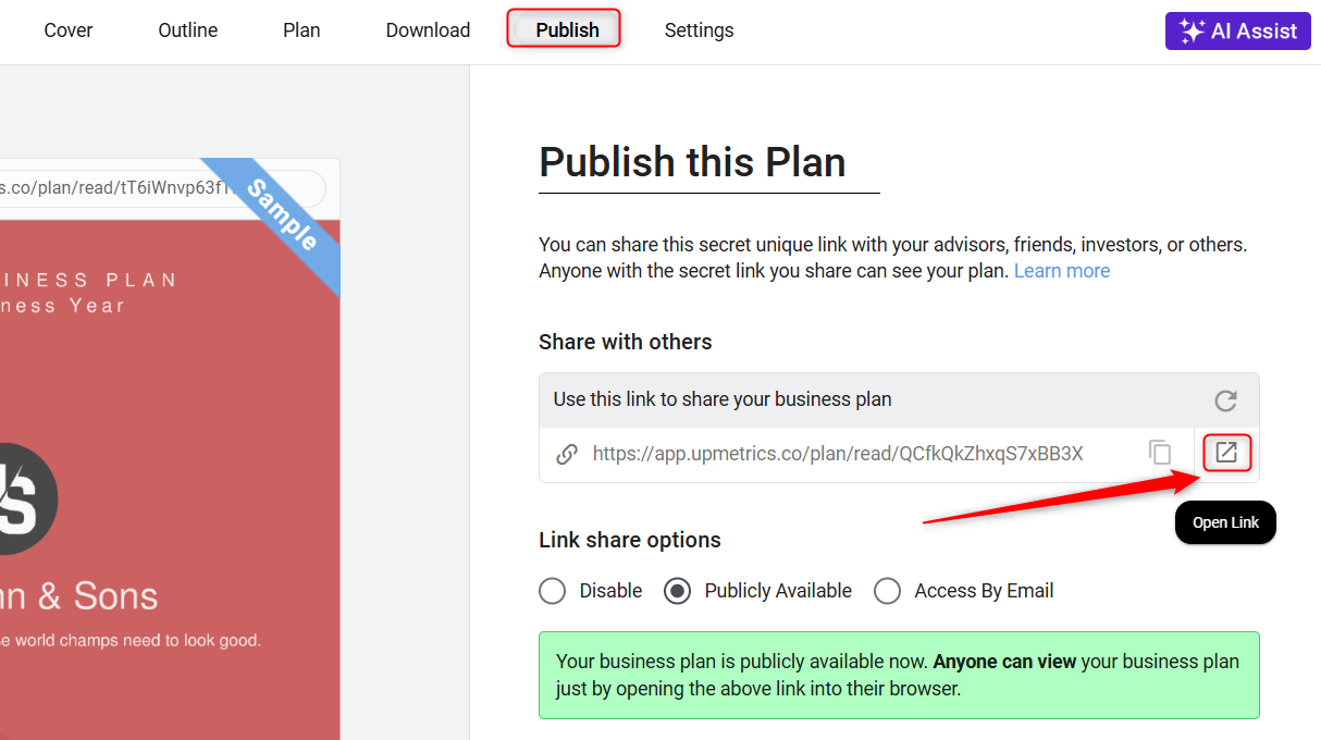Publishing your business plan is a crucial step towards turning your ideas into reality. You can easily and safely share your plan with others via a Secret Unique Link.
