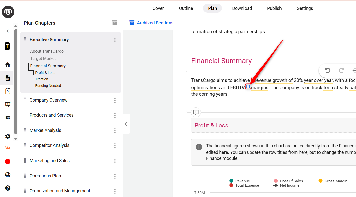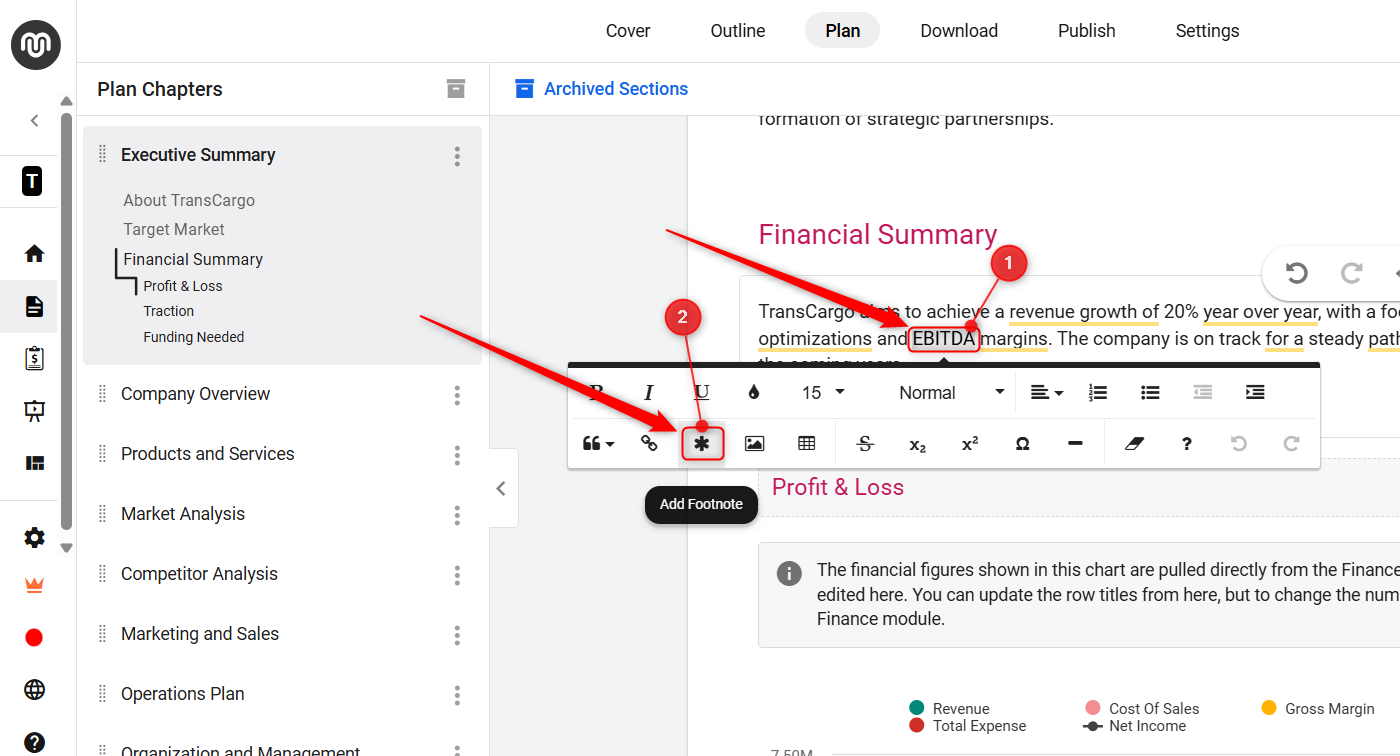 Open the business plan builder and navigate to the section where you want to add a footnote.