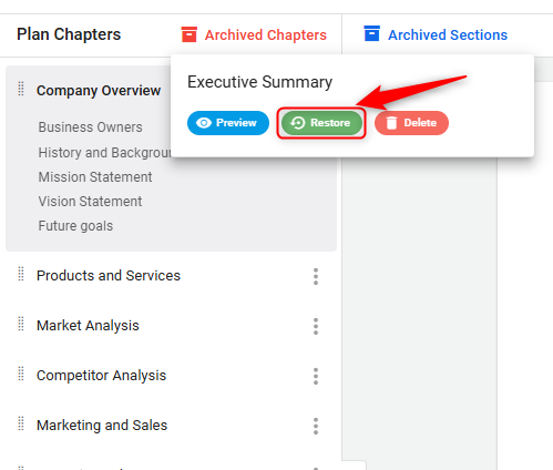 Choose the chapter you wish to restore and click the Restore option to reintegrate it into your business plan. You can delete a chapter by clicking the Delete option.
