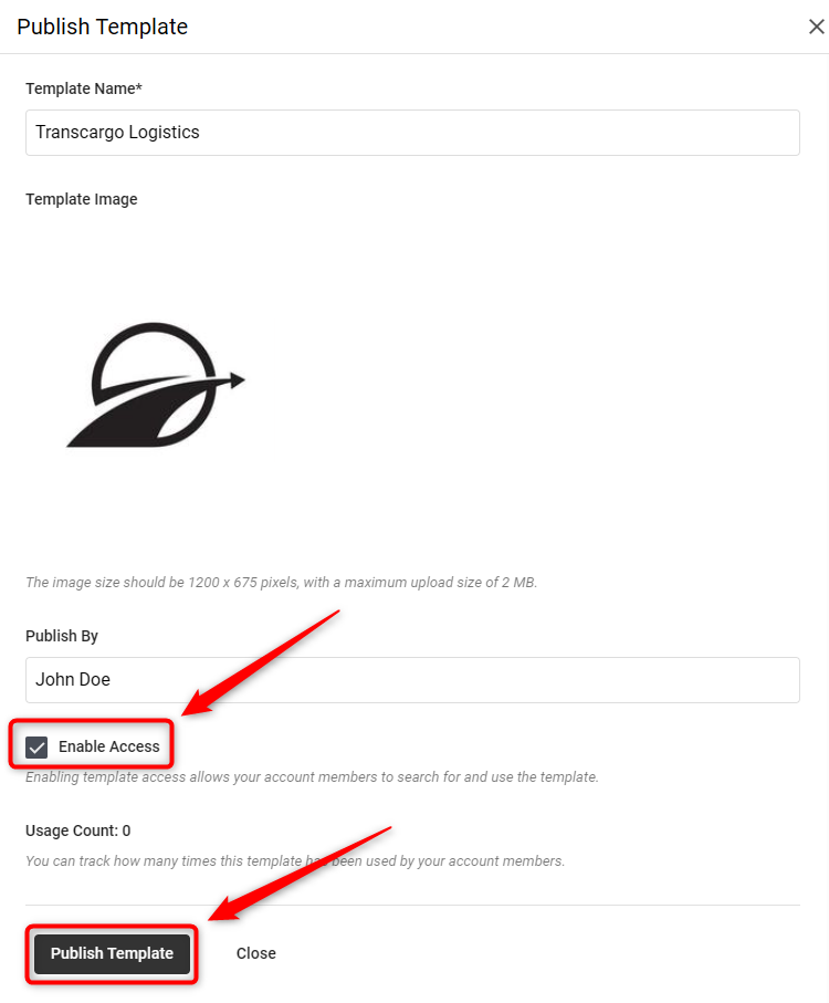 A popup will appear, Enter all required information in the popup, click on "Enable Access" to allow access to this template to your invited Account Member, and then click “Publish Template” to complete the process.
