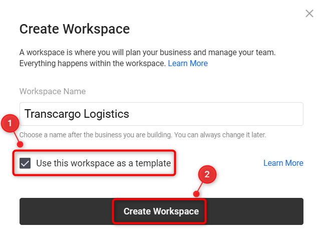 - "Professional Plan" subscribers can utilize the option "Use this workspace as a template" to create customized business templates while adding a new workspace.
