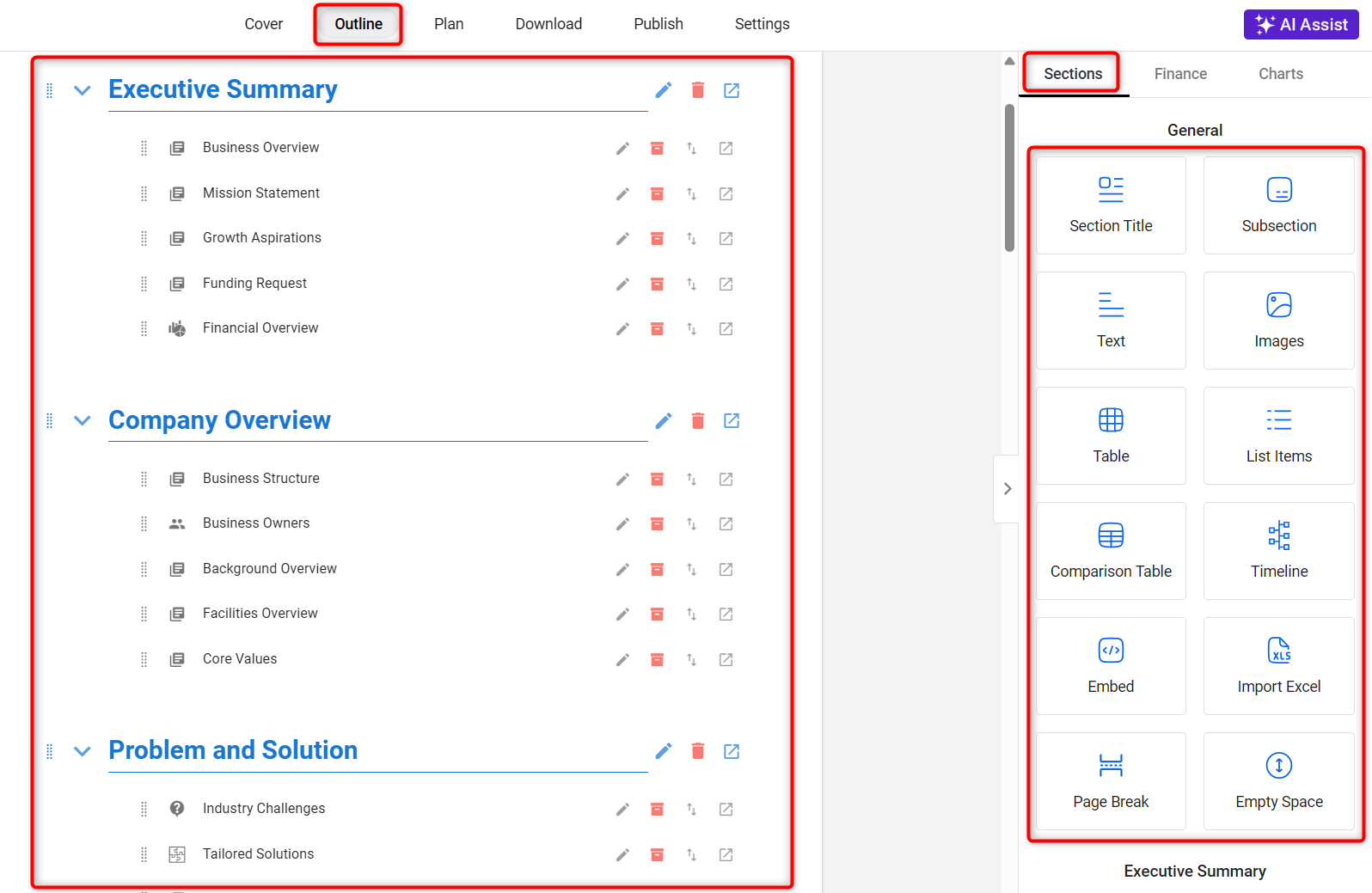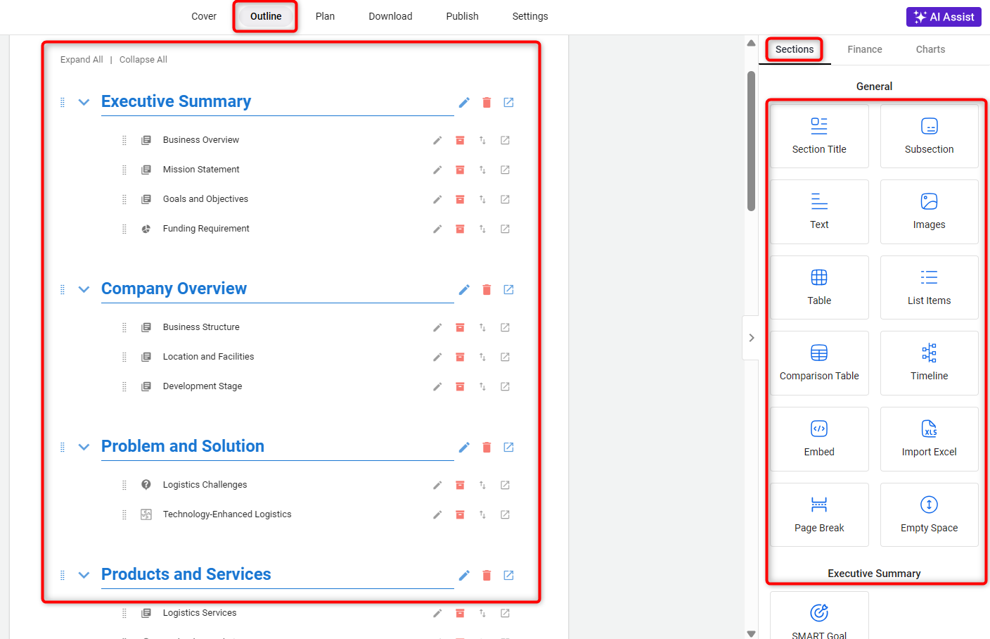 In the outline section of your template, you have the freedom to create a customized structure for your business plan.