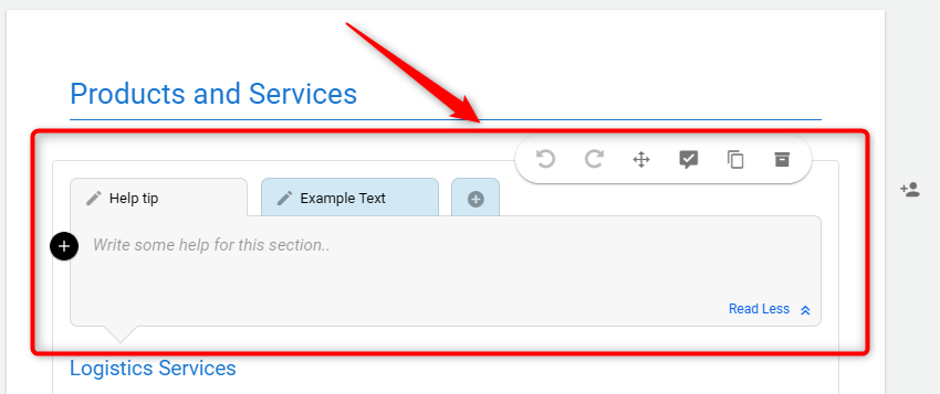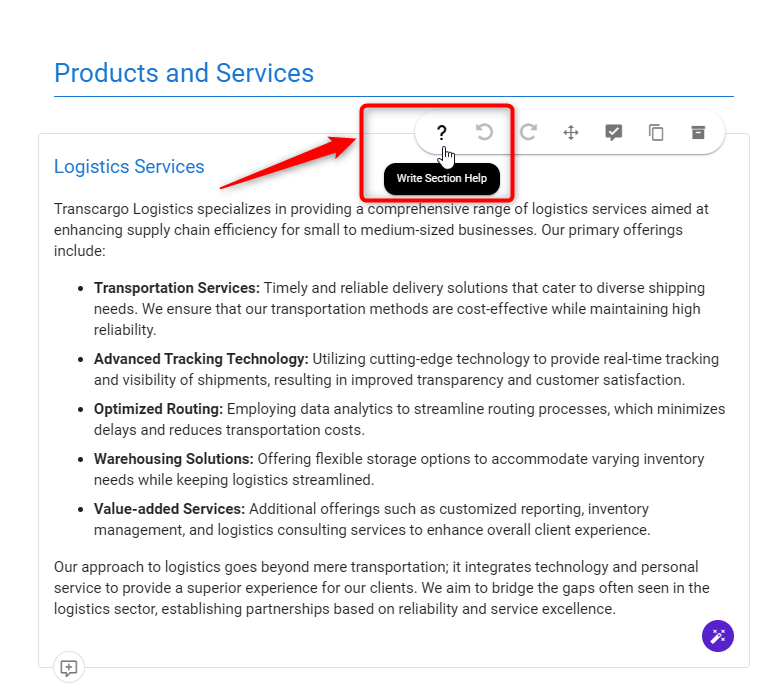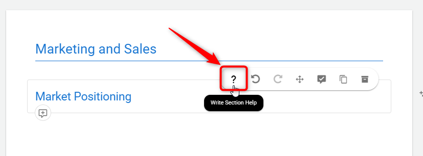 Utilizing the platform's Write Section Help feature, you can precisely place these instructions within each section, ensuring that users have clear, accessible guidance on how to approach and complete each section of their business plan.