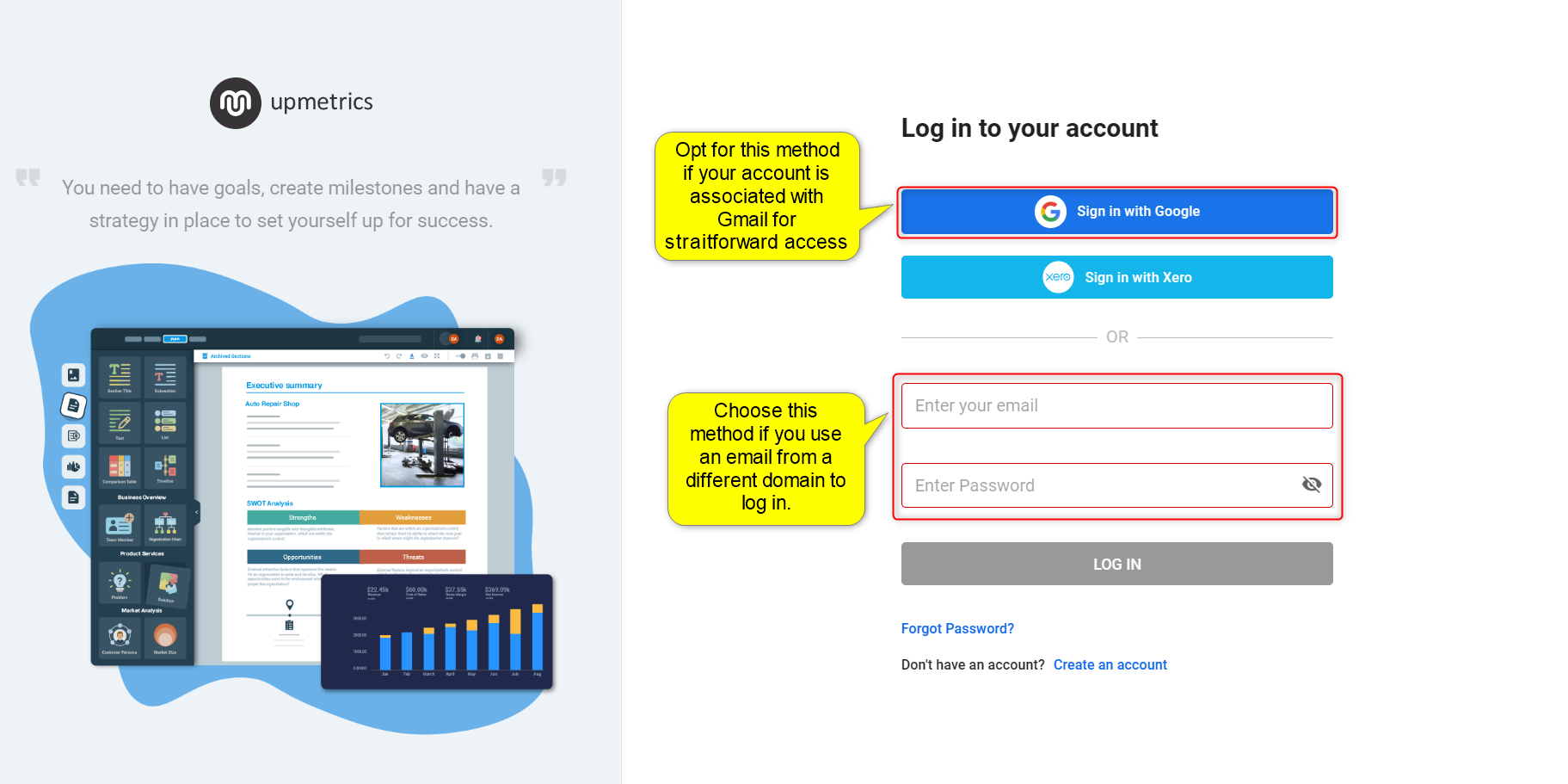 Logging into your Upmetrics account is the first step towards accessing a range of business planning tools.