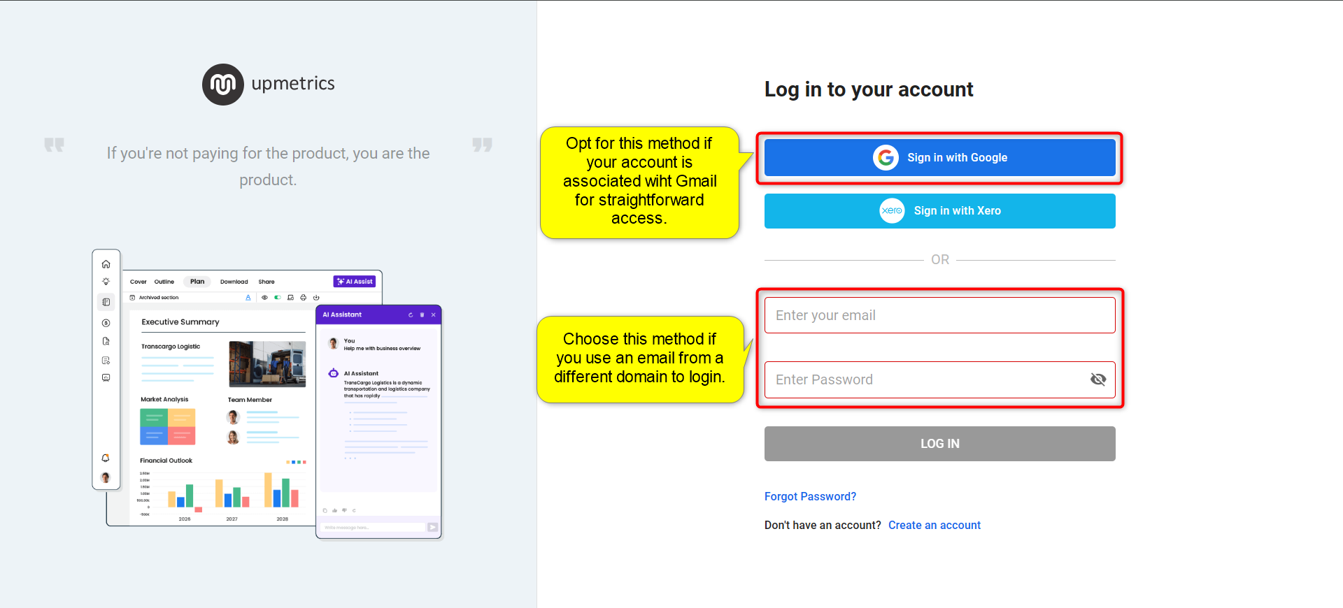 Use the Sign in with Google option for a quick login if your Upmetrics account is linked to a Gmail address. Otherwise, manually input your email and password.