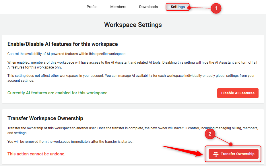 NOTE: Only the workspace owner has the permission to transfer the workspace ownership. Any invited members (collaborators or viewers) will not have the ability to do it.