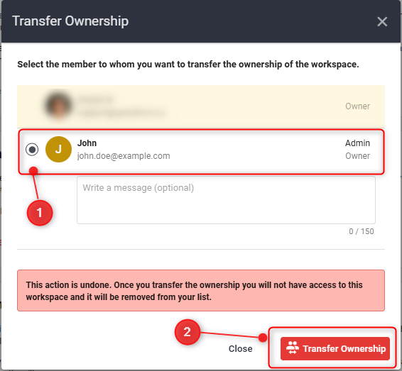 NOTE: Before transferring ownership of the workspace, ensure that the new owner is already a member of the workspace. Only existing members of your workspace can be designated as the new owner, See how to invite a member.