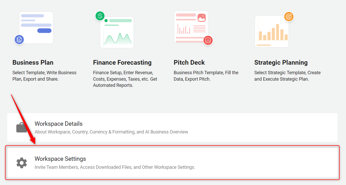 We understand this need and offer a comprehensive solution through the workspace feature. This functionality enables the workspace owner to invite colleagues as collaborators or viewers, fostering a collaborative effort on business plans or other projects within the platform. With this, you can easily collaborate not only with your team members but also with colleagues, advisors, or clients, ensuring everyone stays aligned and engaged in the planning process.