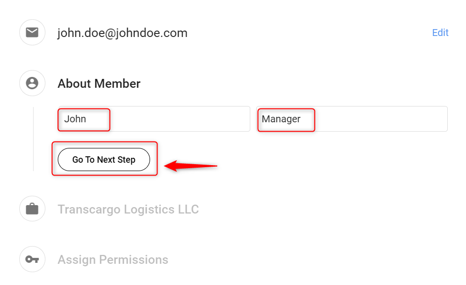 After inputting the email address, you will also need to provide additional details such as their Name & designation, and press enter or click on the Go To Next Step option.