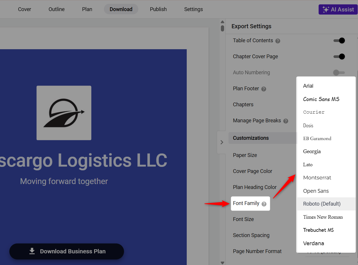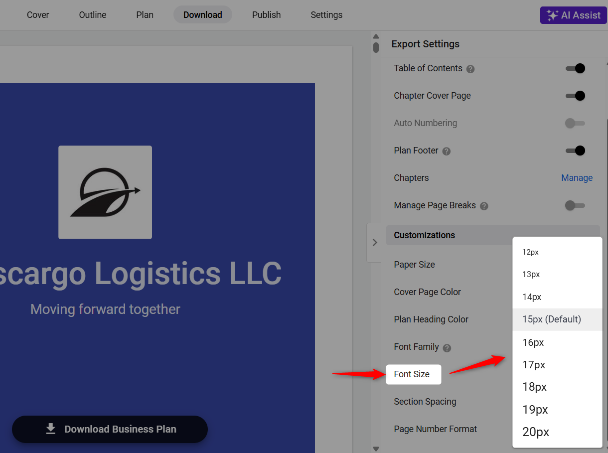 You can change the font style and size in your business plans and pitches easily. This means you can make your document look just the way you want, so it fits your brand and is easy to read.