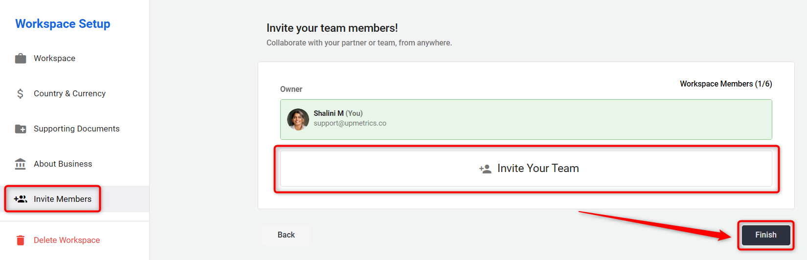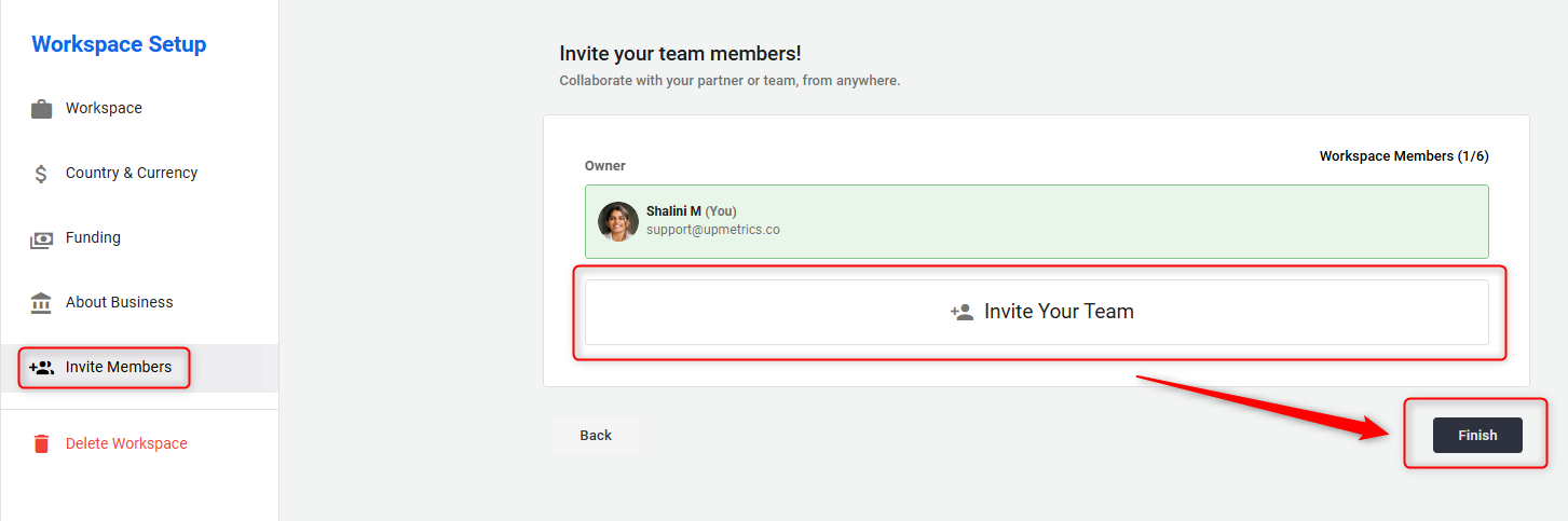 In the final step, under the Invite Members section, you can invite your teammates, colleagues, or business partners to collaborate within the workspace.